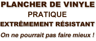 Le revêtement de sol en vinyle a l'aspect de tuiles, de pierres ou de bois. Il résiste aux taches, aux rayures et ajoutons qu'il est à l'épreuve de l'eau à 100%.